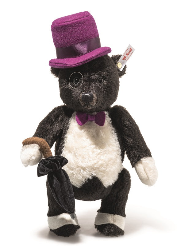 Steiff's wonderful new Elton John bear has been crafted from the finest blue and white wool plush fabrics made to recreate his famous Dodger Stadium outfit from his two sold-out concerts in 1975! He features paw pads, cap and belt made from navy blue glitter fabric and a black hand-stitched...