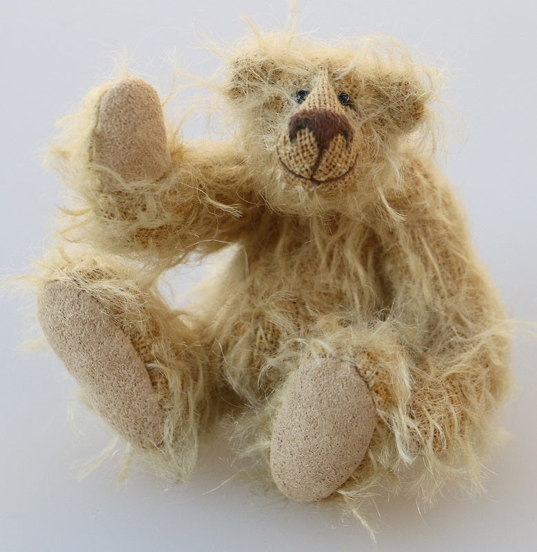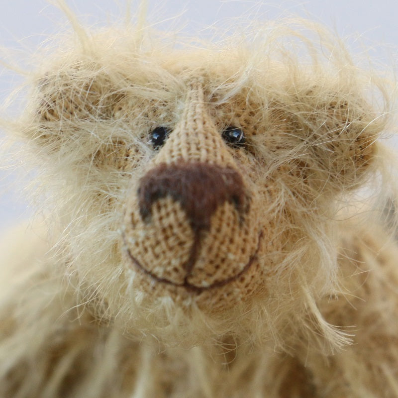 Cleo is a delightful bear crafted from a wonderful, wavy blonde mohair with a light brown backing fabric. She is filled with a little steel shot to give her a lovely, heavy weight and features enchanting glass eyes and felt paws with small, brown stitched claws. Cleo wears a charming dusky...