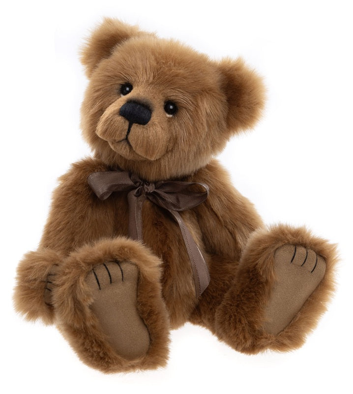 Reynolds is an amazing bear made from long and soft light brown plush fabric mottled with white for a feathered effect. He is part-pellet filled for a lovely weight and features truffle-brown sculpted suedette paw pads. Reynolds wears a large burgundy, brown black satin bow, with knotted ends, for the...