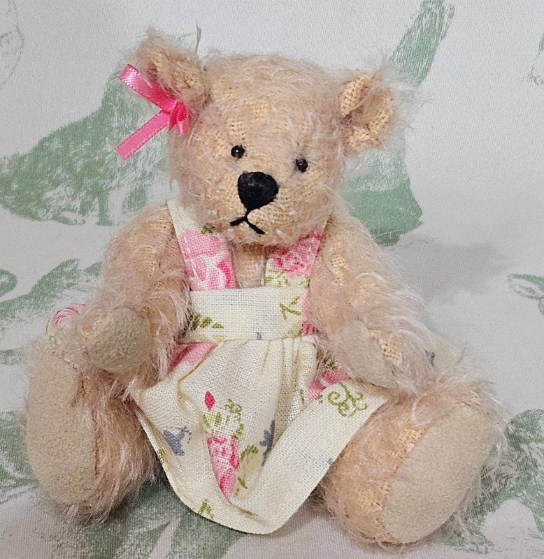 Amy is a wonderful little teddy bear crafted from a long and sparse white mohair with a pale peach coloured backing fabric. She has a lightly waxed, hand stitched black nose and soft, creamy-white suedette paws. Amy wears a made-to-measure dress, featuring a pretty pink rose print, and bubble-gum pink bow in front of her right ear.