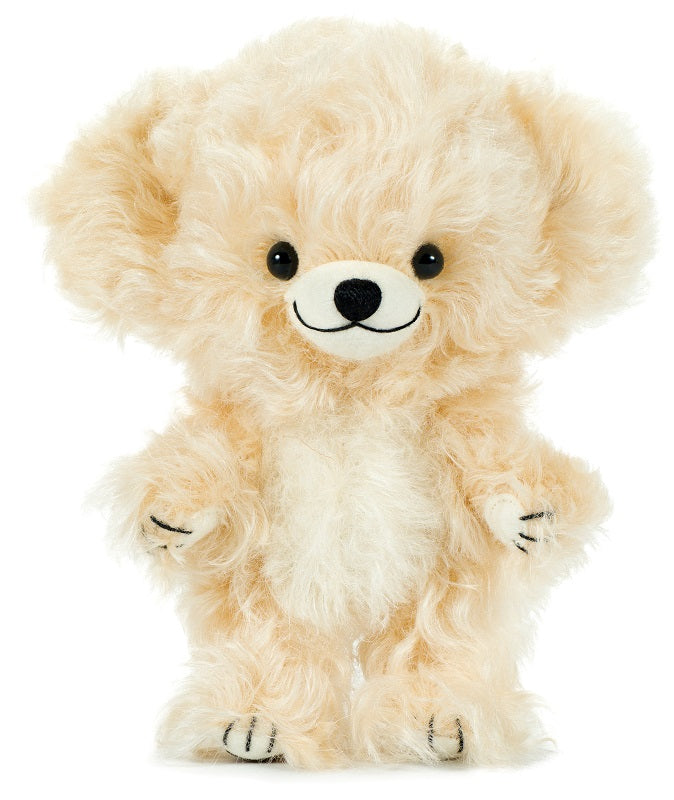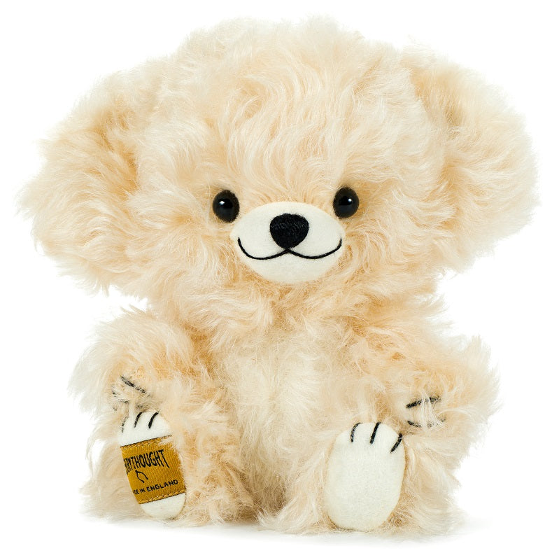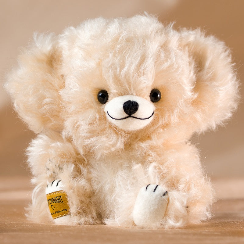 Merrythought’s Cheeky Vanilla Macaron teddy bear is made from a luxuriously dense and wavy creamy white mohair fabric. He features all the charm of a classic Cheeky bear with his beaming smile and a jingle bell in each ear and has endearing dark boot button style eyes, a contrasting lighter belly and a whimsical oversized head!